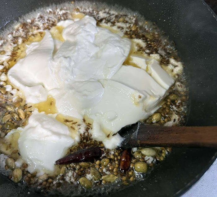 フライパンにクミンとコリアンダーとカルダモンと唐辛子とベイリーフとシナモンとこめ油を入れて香りを出します。そこにヨーグルトを投入し混ぜたところで、パウダースパイス(ターメリック、チリ、クミン、コリアンダー、カルダモン)を入れます。