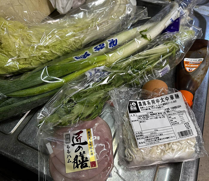 材料は冷凍の中華麺と、ハム、白菜と水菜と長ネギと卵とソースです。