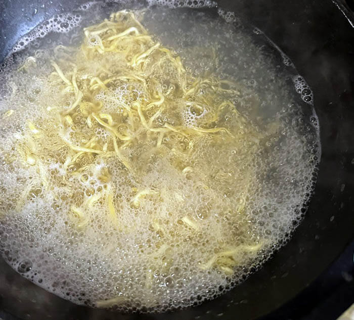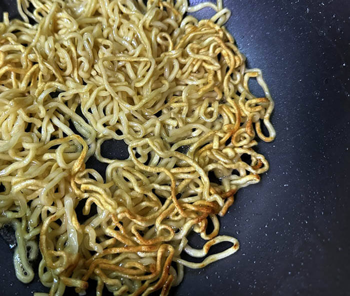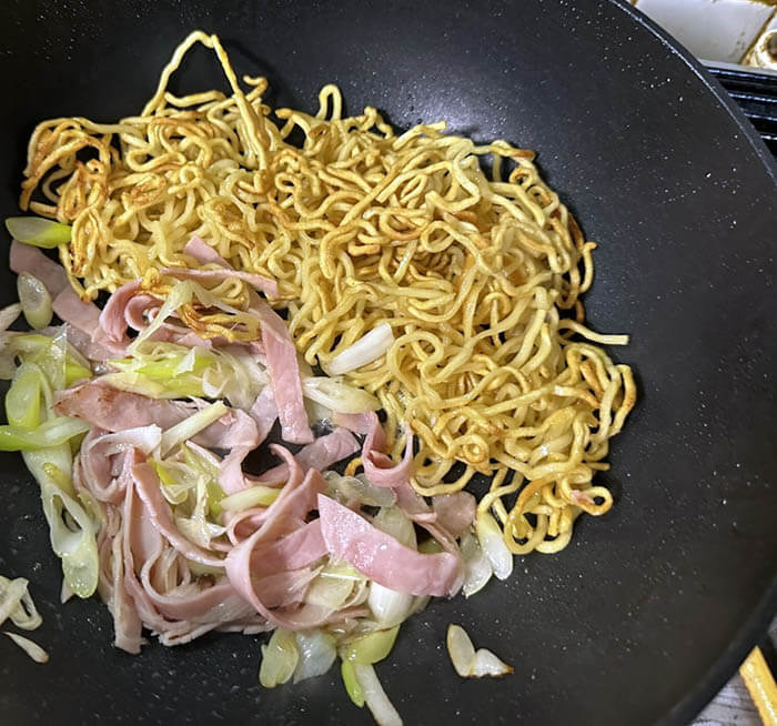 麺は茹でて多めの油でカリっとなるまで焼き込んでおきます。