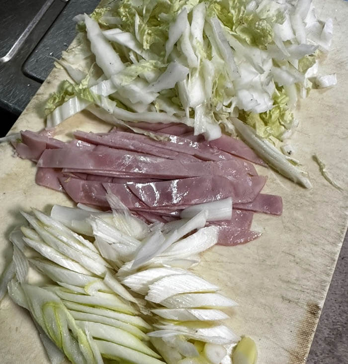 ハムと長ネギと白菜は粗目の千切りにしておきます。