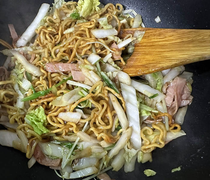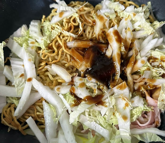 麺を片側に寄せて、ハムと長ネギを炒めてシナっとしてきたところで、ソースを入れて、白菜を上からかぶせて一気に炒めます。