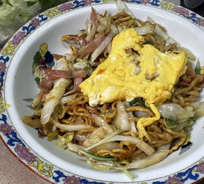 明後日の事務所お引っ越しのため、一人事務所ランチは残り物のソース焼きそばです。